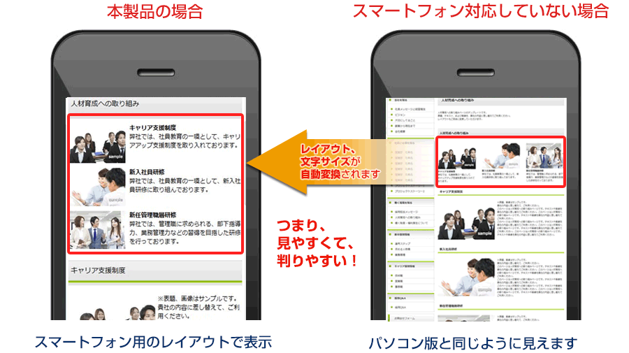 スマートフォンで見た際に自動で最適なサイズに変換されます。